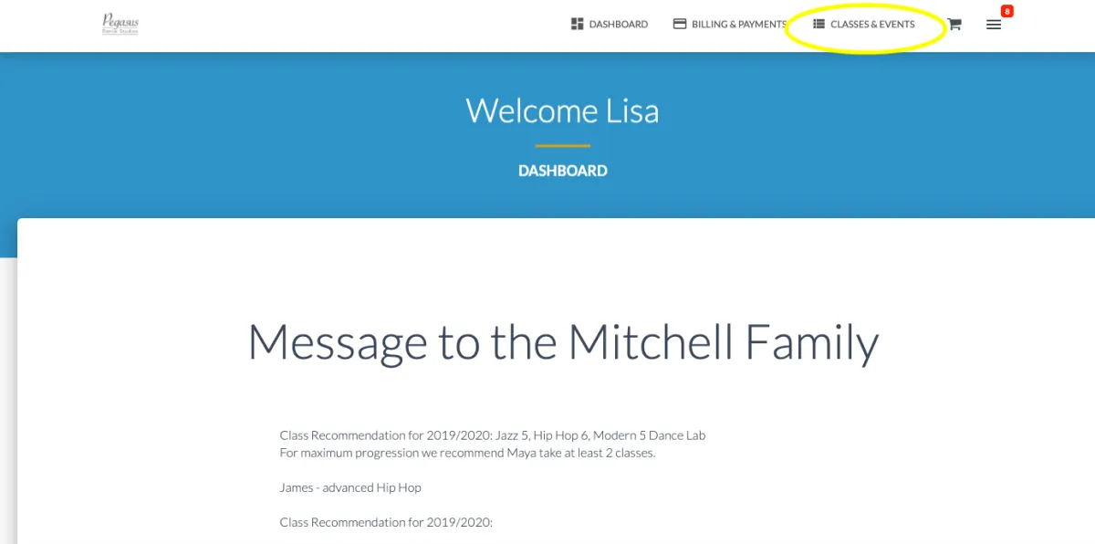 1. Click on "Classes & Events" or scroll down to view your student's name