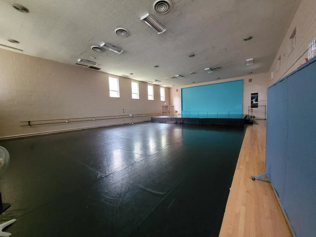 Included: Sprung dance floor, extra high ceilings, rehearsal stage, mirrors (can be covered), piano, stereo